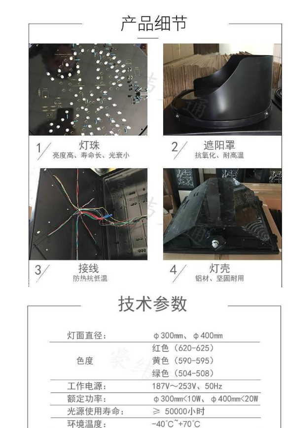 十字路口交通信號燈光源采用超高亮度四元素LED發(fā)光二極管:光強高、衰減少、壽命長;并采用恒流供電:可靠性高、穩(wěn)定性強、電壓適應(yīng)范圍寬 燈殼采用一次性鋁壓鑄或工程塑料注塑......